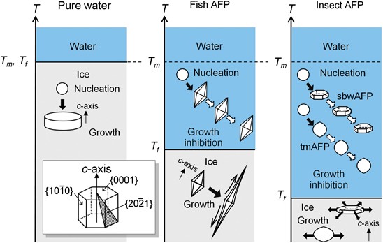 纯水(左),鱼类防冻蛋白溶液(中)和昆虫防冻蛋白溶液(右)中的冰晶增长图示